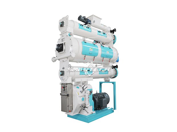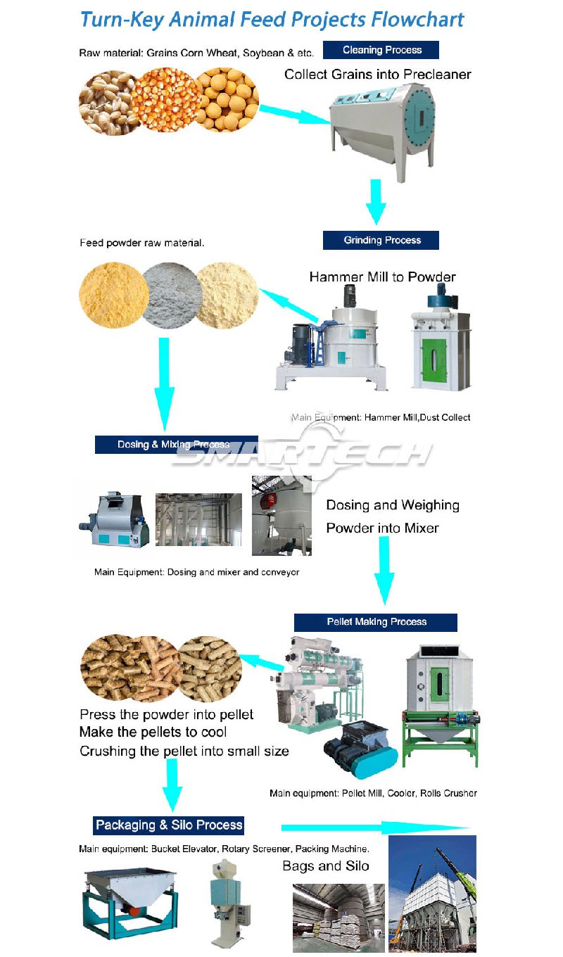 Main Feed Machine: Bucket Elevator → Storage Bin → Pellet Mill → Cooler → Fan → Cyclon → Double Rollers Crumbler.